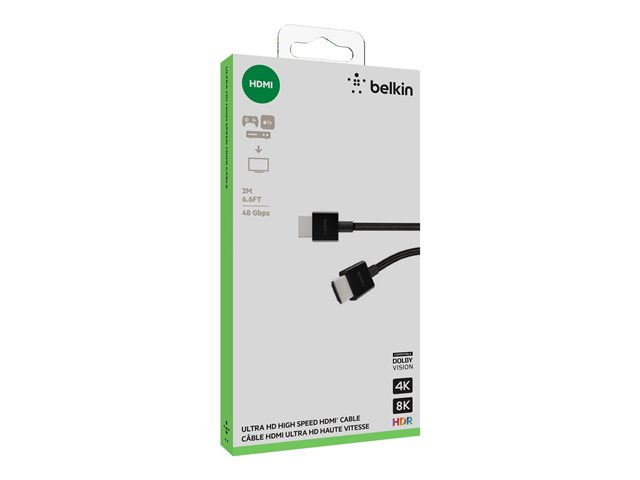 Description du produit Belkin câble HDMI - 2 m Câble Ultra High Speed - câble HDMI Longueur 2 m Couleur Noir Connecteur HDMI - mâle Connecteur (deuxième extrémité) HDMI - mâle Fonctions Torsadé -