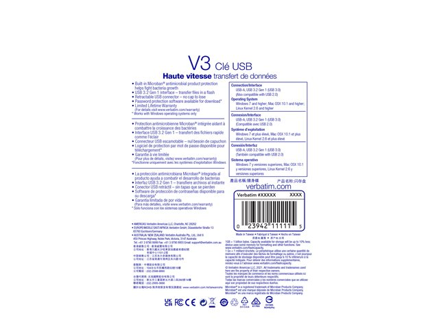Un stockage de classe mondiale au bout des doigts ! Sauvegardez et transférez vos fichiers plus rapidement avec les clés USB Verbatim Store 'n' Go V3. Doté d'un design sans capuchon, le boîtier rétractable protège le connecteur USB et se glisse facilement à l'intérieur et à l'extérieur. L'interface USB 3.2 Gen 1 offre des vitesses de transfert de données supérieures à celles de l'USB 2.0, ce qui facilite le transfert de plusieurs fichiers à la fois ou de fichiers volumineux sans erreur. Pas de ports USB 3.2 Gen 1 ? Pas de problème ! Cette clé est rétrocompatible avec les ports USB 2.0. Ces clés USB Verbatim intègrent la protection antimicrobienne Microban. Cette technologie antimicrobienne aide à prévenir la prolifération des bactéries, ce qui permet de garder vos clés USB plus propres.
