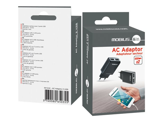 Description du produit Mobilis adaptateur secteur - USB Type de Produit Adaptateur secteur Dimensions (LxPxH) 8.7 cm x 3.8 cm x 2.2 cm Poids 44 g Type de prise Total 2: USB Tension requise CA 100-240 V Courant électrique max. 1 A Garantie du fabricant Garantie de 2 ans -