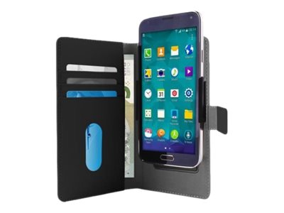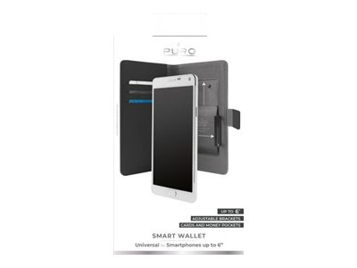 La protection universelle "Smart Wallet" pour smartphones possède des ailettes réglables qui permet de s'adapter parfaitement à de nombreux smartphones. Son système coulissant permet de faire glisser le smartphone vers le haut ou le bas pour laisser libre accès à la caméra. Fabriquée en éco cuir, la protection possède un rabat magnétique frontal.