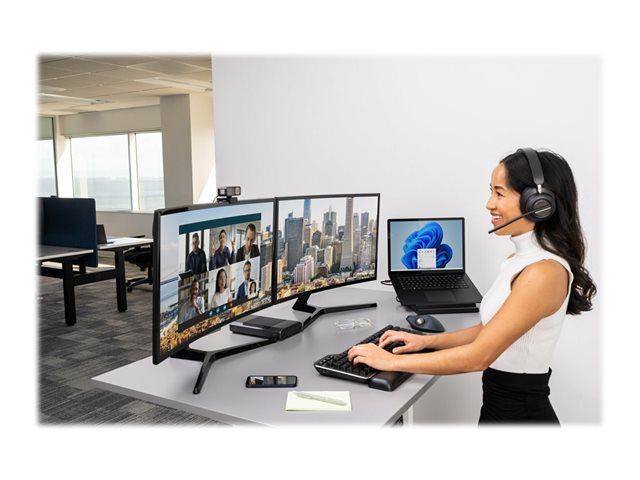 Le micro-casque Bluetooth H3000 de Kensington offre une expérience immersive et subtile, la liberté de mouvement du sans fil et une technologie audio supérieure. Les écouteurs à mémoire de forme avec gel refroidissant recouverts d'un tissu à transfert de chaleur offrent un confort longue durée. Les témoins lumineux confirment le statut et réduisent les distractions. De plus, les commandes de musique avec technologie de détection d'appels simplifient les transitions et l'effet vocal (Sidetone) optimise les appels. Les haut-parleurs dynamiques de 40 mm en néodyme vous offrent une expérience audio de pointe pour les appels et la musique. La batterie longue durée avec technologie de chargement rapide vous permet d'utiliser le casque pendant qu'il se recharge. Le micro-casque H3000 fait partie de l'écosystème de visioconférence professionnelle de Kensington. Vous bénéficiez ainsi d'une expérience intégrée qui vous permet de consacrer plus de temps à accroître votre productivité.