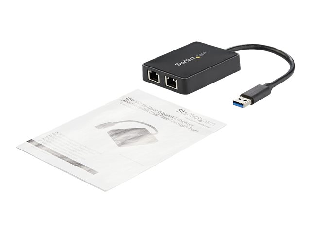 Convertisseur USB vers 2x RJ45 avec port USB intégré - Noir - Adaptateur réseau - USB 3.0 - 1GbE - 1000Base-T - 2 ports - noir
