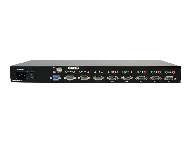 Le commutateur USB VGA KVM 8 ports à montage sur rack SV831DUSBAU (avec câbles audio inclus) vous permet de commander jusqu'à 8 ordinateurs connectés par USB à l'aide d'un seul jeu de clavier, souris et écran. Il offre de plus des ports audio et pour microphone afin de pouvoir basculer entre les signaux audio, ainsi qu'entre les ports pour PC.