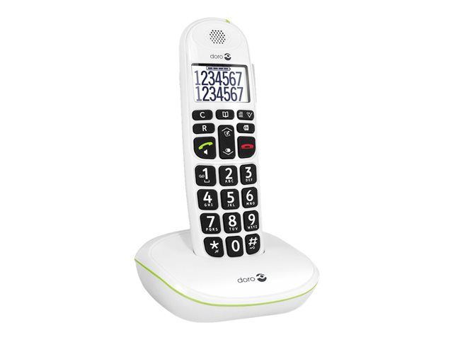Le téléphone sans fil DECT Doro PhoneEasy 110 est très facile à lire. De plus, son écran rétro-éclairé hautement contrasté affiche les noms complets et les numéros sans devoir faire défiler l'écran. Les larges touches à retour vocal facilitent la numérotation tandis que le TrueSound de Doro offre un son clair de bonne qualité pour des conversations encore plus agréables. Il offre également un mains-libres au son puissant.